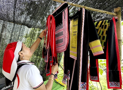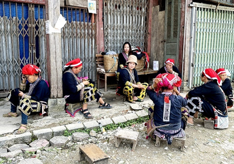 Preserving and promoting the quintessence of brocade embroidery is also a way for Sa Pa to introduce its rich tourism image to domestic and foreign tourists. In the photo: Foreign visitors learn about the patterns and brocade embroidery of Red Dao women.