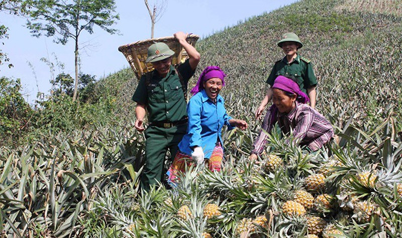 Bộ đội biên phòng Bản Lầu giúp nhân dân thu hoạch dứa.