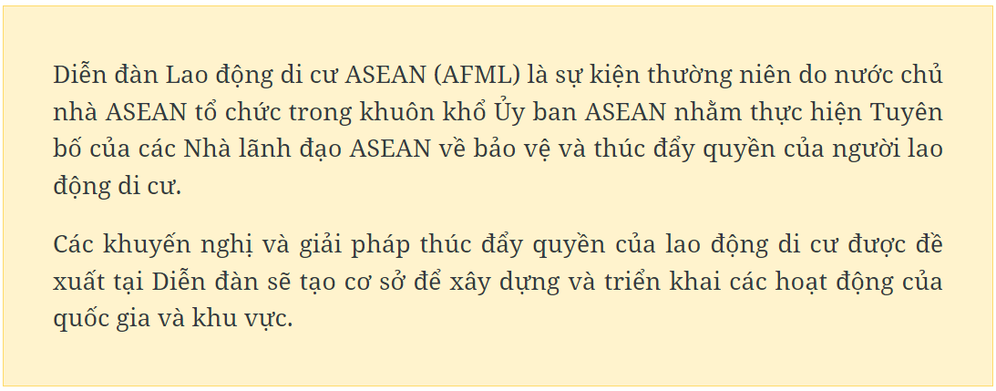 ASEAN nói chung và Việt Nam nói riêng đã cùng nhau trao đổi, thảo luận về nhiều chủ đề liên quan đến lao động di cư nhằm tăng cường nhận thức của cộng đồng về vai trò của người lao động, cũng như các biện pháp bảo vệ lao động di cư bằng luật pháp và chính sách và các hành động của các bên ở cả cấp khu vực và quốc gia đặc biệt là trước những thay đổi về cấu trúc nhân khẩu học, thị trường lao động và quan hệ lao động.