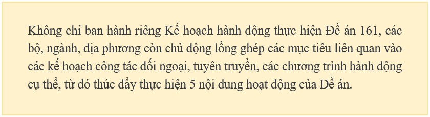 Không chỉ ban hành riêng Kế hoạch hành động thực hiện Đề án, các bộ, ngành, địa phương còn chủ động lồng ghép các mục tiêu liên quan vào các kế hoạch công tác đối ngoại, tuyên truyền, các chương trình hành động cụ thể, từ đó thúc đẩy thực hiện 5 nội dung hoạt động của Đề án.