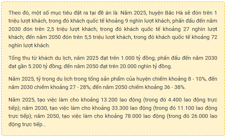 Vì vậy, việc xây dựng Đề án phát triển huyện Bắc Hà trở thành điểm đến đặc sắc của tỉnh Lào Cai, khu vực Tây Bắc giai đoạn 2024 - 2030, tầm nhìn đến năm 2050 trở thành khu du lịch quốc gia là quan trọng và cần thiết.