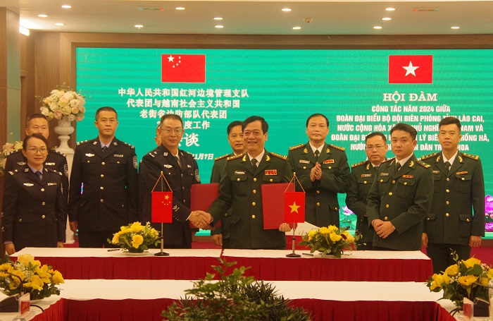 BĐBP tỉnh Lào Cai (Việt Nam) và Chi đội trưởng quản lý biên giới Hồng Hà, tỉnh Vân Nam (Trung Quốc) ký kết biên bản Hội đàm tại thị xã Sa Pa. (Trung Dũng)