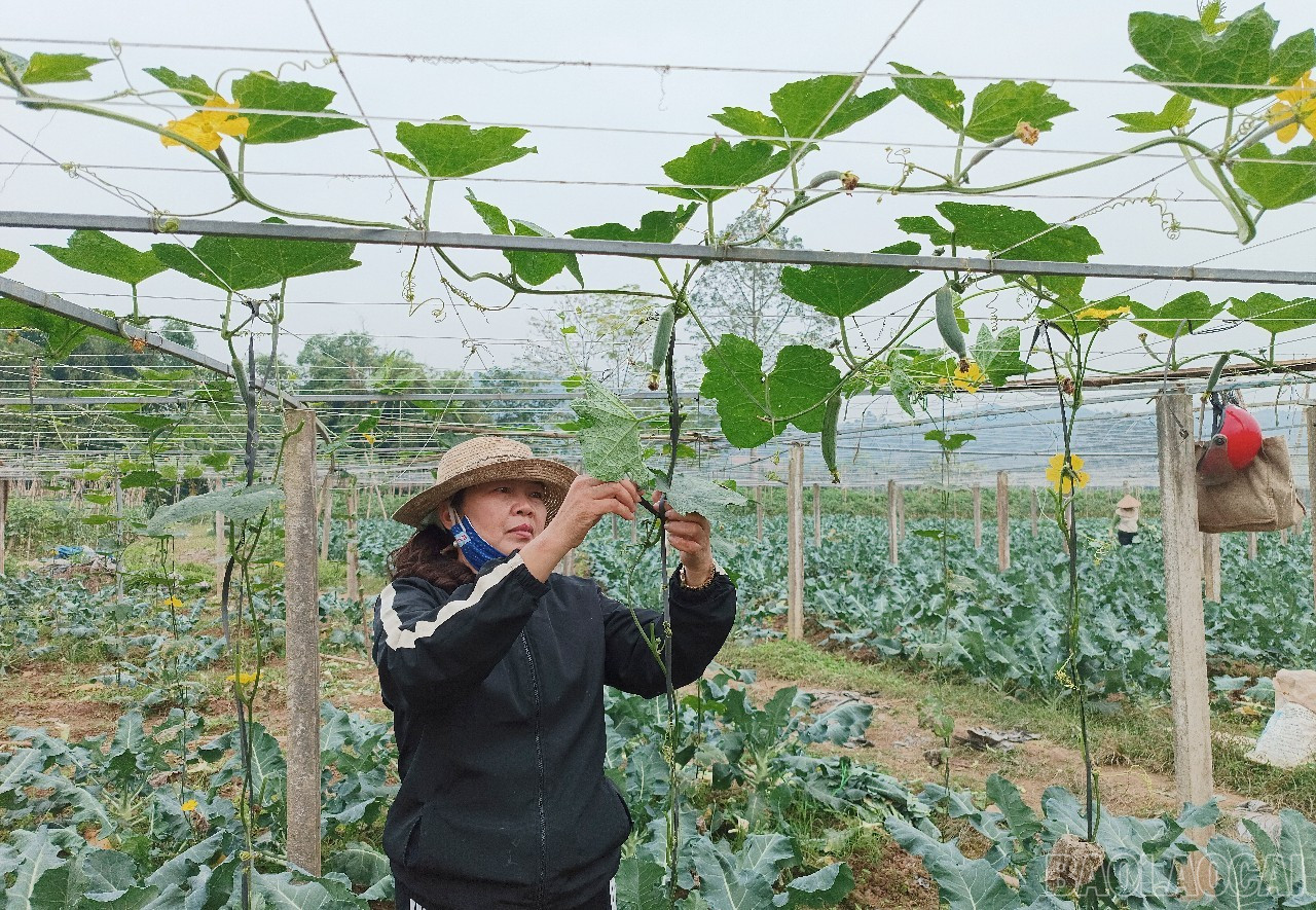 Gia đình chị Trịnh Thị Duyên Bích ở thôn Thái Bo, xã Thống Nhất, thành phố Lào Cai, vừa thu hoạch cây súp lơ, vừa chăm sóc cây mướp đắng trên cùng vườn rau màu.