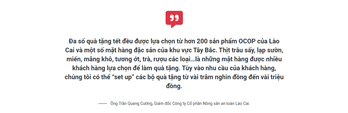 Vừa hướng dẫn nhân viên lựa chọn, đóng gói các sản phẩm vào hộp quà theo đơn đặt hàng của đối tác, ông Trần Quang Cường, Giám đốc Công ty Cổ phần Nông sản an toàn Lào Cai vừa liên tục trả lời, tư vấn cho khách hàng về những bộ quà tặng tết từ nông sản của Lào Cai. Theo ông Cường: Trước đây, những giỏ quà tết thường được đóng gói từ bánh kẹo nhập khẩu, rượu ngoại hay các sản phẩm công nghiệp. Tuy nhiên, nhận thức về sức khỏe và xu hướng tiêu dùng xanh đã thúc đẩy người tiêu dùng tìm kiếm những sản phẩm tự nhiên, an toàn và có nguồn gốc rõ ràng. Vì vậy, quà tặng tết từ nông sản, đặc sản có cơ hội “lên ngôi” và được nhiều khách hàng lựa chọn trong dịp tết cổ truyền của dân tộc. Quà tặng tết được lên đơn hàng từ nông sản Lào Cai không chỉ bảo đảm chất lượng, phù hợp với túi tiền của mọi đối tượng khách hàng mà mẫu mã đẹp, thể hiện sự trân trọng đối với người nhận, góp phần quảng bá nông sản địa phương ra ngoài tỉnh.