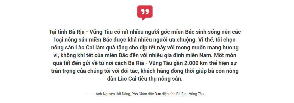 Sinh ra và lớn lên ở miền Bắc, anh Nguyễn Hải Đăng, Phó Giám đốc Bưu điện tỉnh Bà Rịa - Vũng Tàu ưa thích và có ấn tượng tốt với các loại đặc sản, nông sản của Lào Cai. Vì vậy, tết Nguyên đán năm nay, anh Đăng đã đặt hàng Công ty Cổ phần Nông sản an toàn Lào Cai gần 400 bộ quà tặng từ nông sản (giá trị từ 400 nghìn đồng đến 1 triệu đồng/bộ) để bán và tặng cho khách hàng, đối tác.