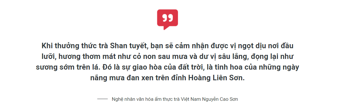 “Tôi nhớ là một ngày nắng đẹp năm 2017, trong chuyến đi khảo sát cùng lực lượng kiểm lâm Vườn Quốc gia Hoàng Liên, tôi tình cờ đứng giữa rừng chè cổ thụ mọc tự nhiên trên độ cao gần 1.000 mét. Những cây chè Shan tuyết ở đây không giống bất kỳ giống chè nào tôi từng gặp. Chúng sừng sững, mạnh mẽ với khối rễ dày, cứng cáp cắm sâu vào đá, lá xanh thẫm phủ lớp lông mịn màng như sương tuyết. Khi quả già rụng xuống, chúng tôi mới nhận ra đó là cây chè. Quả thật, tôi như thấy mình quá nhỏ bé trong dòng chảy miên viễn của thiên nhiên” - nghệ nhân văn hóa ẩm thực trà Nguyễn Cao Sơn kể lại.