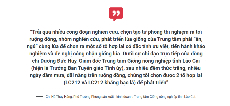 Nhớ lại thời gian đầu nghiên cứu, phát triển giống lúa mới, chị Hà Thúy Hằng, Phó Trưởng Phòng sản xuất - kinh doanh, Trung tâm Giống nông nghiệp tỉnh Lào Cai - một trong những người đầu tiên đặt nền móng cho việc nghiên cứu, phát triển giống lúa LC212 chia sẻ: Trước năm 2008, kinh nghiệm sản xuất lúa giống của chúng tôi gần như bằng 0 nên việc nghiên cứu, sản xuất gặp rất nhiều khó khăn. Bên cạnh trình độ hạn chế thì điều kiện giao thông, phương tiện kỹ thuật và tuổi đời, tuổi nghề của nhóm nghiên cứu còn khá trẻ cũng là những trở ngại đối với công tác nghiên cứu, sản xuất lúa giống. Vượt qua những khó khăn, trở ngại đó, năm 2008, Trung tâm đã nỗ lực để nghiên cứu, phát triển các giống lúa mới mang thương hiệu Lào Cai.