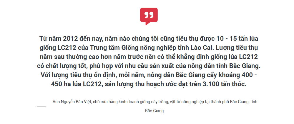 Có được lòng tin của nông dân, mỗi năm, Trung tâm Giống nông nghiệp tỉnh Lào Cai sản xuất và cung ứng ra thị trường khoảng 30 - 40 tấn lúa giống LC212, lượng giống này hiện vẫn chưa đủ đáp ứng nhu cầu sản xuất của nông dân trong và ngoài tỉnh.