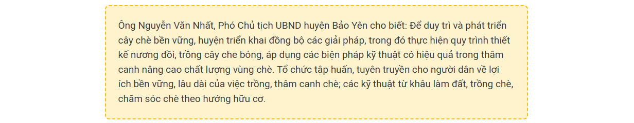 Theo đó, huyện Bảo Yên chỉ đạo các hộ loại bỏ các cây trồng xen ra khỏi nương chè, đảm bảo mật độ cây che bóng phù hợp, đồng thời vận động, tuyên truyền người dân trồng lại các diện tích chè đã tự ý chặt bỏ. Tập trung nâng cao năng suất, chất lượng chè ổn định; hỗ trợ doanh nghiệp xây dựng kế hoạch phát triển và ổn định thị trường tiêu thụ, tăng hình thức chế biến sản phẩm chè chất lượng cao, có giá trị, tạo thương hiệu mạnh trên thị trường (chè xanh duỗi, chè Ô long, hồng trà, bạch trà, trà matcha, trà túi lọc...).