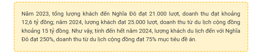 Với việc triển khai đồng bộ các giải pháp, lượng khách du lịch đến với điểm du lịch Nghĩa Đô khá ổn định, đạt tỷ lệ cao so với mục tiêu Đề án Phát triển du lịch tâm linh và du lịch cộng đồng gắn với bảo tồn và phát huy giá trị văn hóa truyền thống giai đoạn 2020 - 2025 của huyện đề ra.