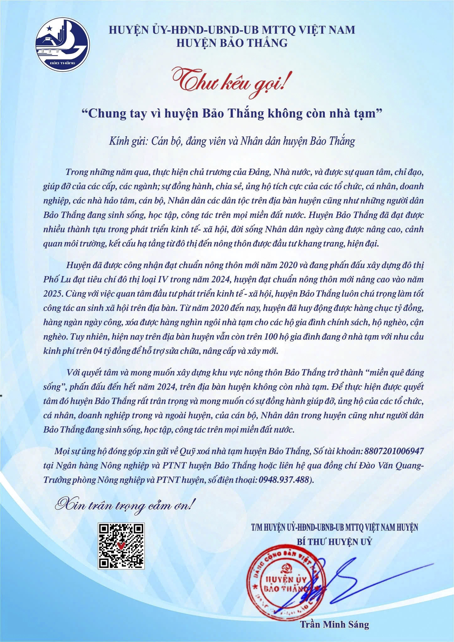 Thư kêu gọi “Chung tay vì huyện bảo Thắng không còn nhà tạm”.