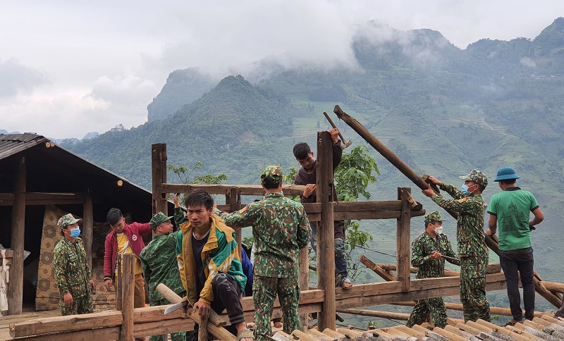 Bộ đội Biên phòng Đồn Tả Gia Khâu, huyện Mường Khương giúp dân làm nhà. (Ảnh Trung Dũng)