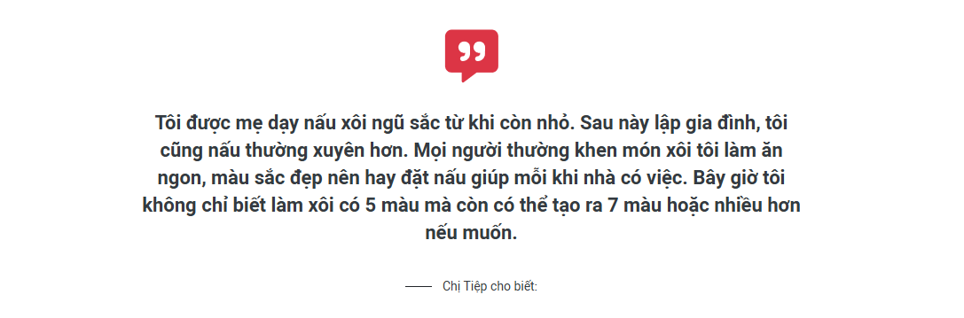 Theo lời giới thiệu của nhiều người dân trong vùng, chúng tôi tìm tới nhà chị Nguyễn Thị Chục (tên thường gọi là Hạnh Tiệp), ở bản Hốc, xã Nghĩa Đô, huyện Bảo Yên. Chị Tiệp là người có tay nghề trong việc nấu xôi màu hay còn gọi là xôi ngũ sắc. Chị biết cách sử dụng nhiều loại lá, cây, củ tự nhiên để tạo ra các màu xôi khác nhau. Không chỉ được giao đảm nhiệm chế biến món ăn này trong mâm cỗ của gia đình mỗi khi nhà có việc mà chị Tiệp còn được nhiều người đặt mua khi có nhu cầu.
