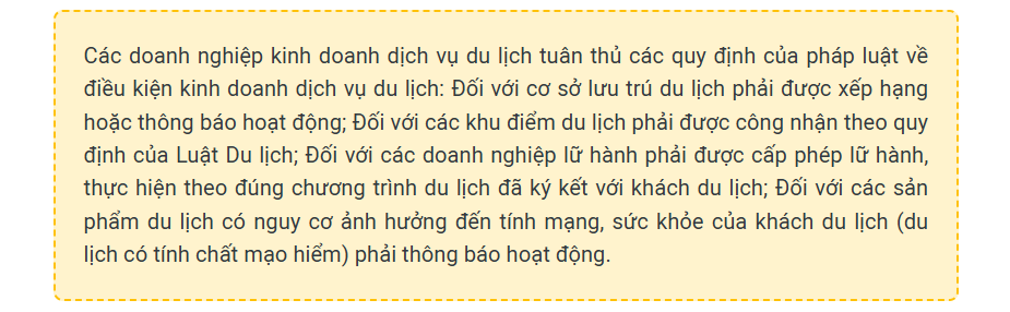 Các doanh nghiệp chủ động phương án tổ chức các hoạt động phục vụ khách du lịch, bố trí đủ nhân lực, cơ sở vật chất, thực phẩm và các điều kiện cần thiết để phục vụ du khách bảo đảm an toàn, chất lượng.