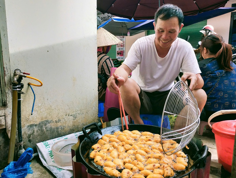 Chú Vàng Văn Thu - đang rán bánh Sú phục vụ du khách tại chợ phiên Bắc Hà.