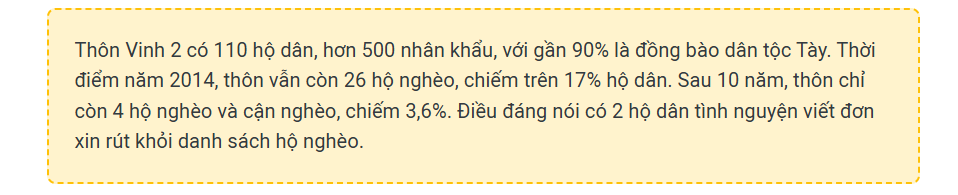 Bí thư Chi bộ, Trưởng thôn La Thị Vân tươi cười: Bây giờ đa số hộ dân trong thôn đã có nhà xây kiên cố, không còn nhà tạm, nhà dột nát. Thu nhập bình quân của người dân đạt 58 triệu đồng/năm. Một số hộ dân phát triển mô hình kinh tế tổng hợp, có thu nhập trên 100 triệu đồng như gia đình các ông: Vi Quang Hùng, Vi Văn Bào, Lương Minh Sơn, Vi Thế Hoàng, Hoàng Văn Vượt…