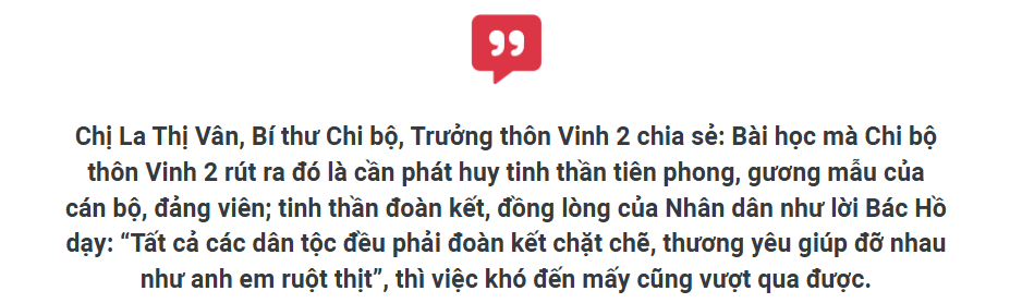 Dạo một vòng quanh thôn Vinh 2, chúng tôi cảm nhận được vùng quê đang từng ngày khởi sắc. Chi bộ thôn Vinh 2 đã kết hợp với Hội Phụ nữ xã xây dựng và ra mắt mô hình “Cải tạo không gian sống cho phụ nữ dân tộc thiểu số” với sự tham gia của 45 hộ dân, gắn biển mô hình “Nhà sạch, vườn đẹp” cho 43 hộ gia đình. Hằng năm, tỷ lệ gia đình văn hóa của thôn đạt trên 98%...