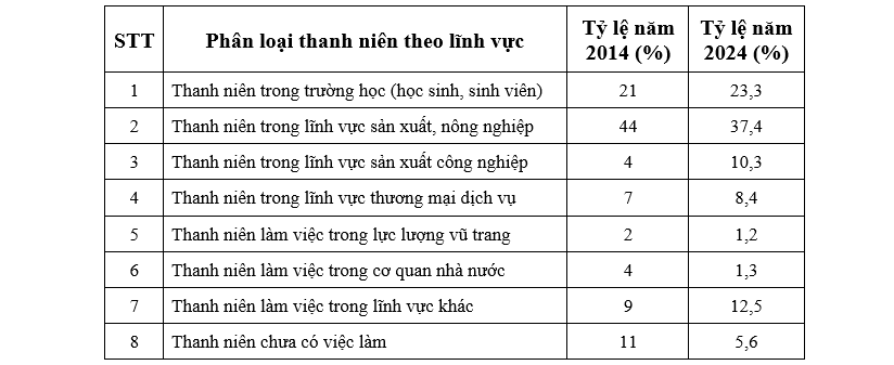 Bảng: Phân loại thanh niên theo lĩnh vực giai đoạn 2014-2024