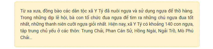 Ngày 24/6/2025, tại thôn Trung Chải, UBND xã Y Tý đã công bố quyết định thành lập và ra mắt Câu lạc bộ Đua ngựa truyền thống xã Y Tý.