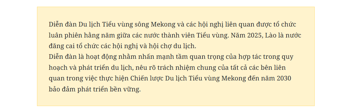 Theo ban tổ chức, trong khuôn khổ Diễn đàn Du lịch Tiểu vùng sông Mekong 2025, các chương trình và hoạt động quan trọng sẽ được tổ chức để các đại biểu nghiên cứu, trao đổi ý tưởng và chia sẻ kinh nghiệm thực tế trong việc phát triển và thúc đẩy ngành du lịch.