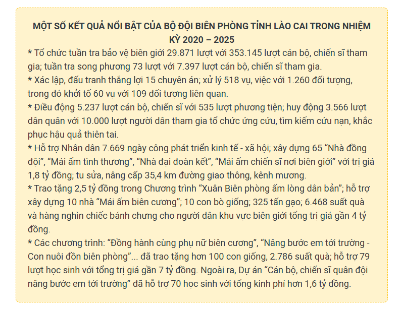 Nhiệm vụ công tác biên phòng và xây dựng đơn vị trong nhiệm kỳ mới có những thuận lợi và thử thách, đòi hỏi mỗi đảng viên, cán bộ, chiến sĩ trong toàn lực lượng Bộ đội Biên phòng tỉnh cần tiếp tục phát huy phẩm chất “Bộ đội Cụ Hồ”, truyền thống vẻ vang của lực lượng, đơn vị để hoàn thành thắng lợi Nghị quyết Đại hội Đảng bộ Bộ đội Biên phòng, Nghị quyết Đại hội Đảng bộ Quân sự tỉnh, Nghị quyết Đại hội Đảng bộ tỉnh Lào Cai nhiệm kỳ 2025 - 2030 và Nghị quyết Đại hội đại biểu toàn quốc lần thứ XIV của Đảng.