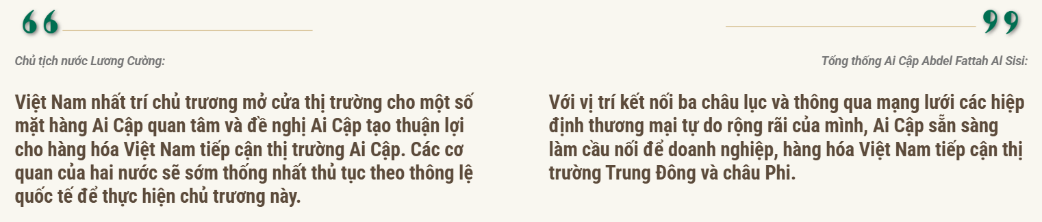 Tại cuộc hội đàm, Tổng thống Abdel Fattah El-Sisi, thay mặt nhân dân Ai Cập, bày tỏ vui mừng được đón Chủ tịch nước Lương Cường và Phu nhân, và khẳng định chuyến thăm cấp Nhà nước của Chủ tịch nước và Đoàn đại biểu cấp cao Việt Nam là một dấu mốc quan trọng, mở ra giai đoạn hợp tác mới cho quan hệ hai nước sau hơn 60 năm thiết lập quan hệ ngoại giao.