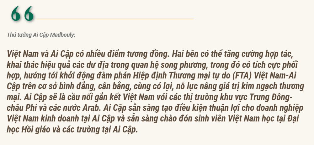 Tổng thống Ai Cập bày tỏ lòng ngưỡng mộ sâu sắc đối với Chủ tịch Hồ Chí Minh, ca ngợi lịch sử hào hùng và những thành tựu phát triển vượt bậc mà Việt Nam đã đạt được dưới sự lãnh đạo sáng suốt của Đảng Cộng sản Việt Nam, đồng thời bày tỏ mong muốn thúc đẩy hơn nữa mối quan hệ hữu nghị truyền thống và gắn bó son sắt như giữa những người anh em với Việt Nam.