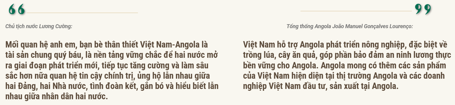 Tại cuộc hội đàm, Chủ tịch nước Lương Cường đã cùng Tổng thống Angola điểm lại những dấu mốc quan trọng trong lịch sử quan hệ hai nước khởi nguồn từ những ngày tháng cùng nhau đoàn kết trong đấu tranh giải phóng dân tộc, thống nhất đất nước, với biểu tượng hữu nghị là Đại lộ Hồ Chí Minh tại trung tâm thủ đô Luanda, Angola.