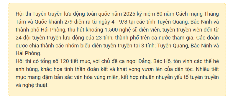 Hội thi Tuyên truyền lưu động toàn quốc năm 2025 kỷ niệm 80 năm Cách mạng Tháng Tám và Quốc khánh 2/9 đã bế mạc và trao giải vào tối qua (9/8), tại Quảng trường Nhà hát thành phố Hải Phòng, đoàn Lào Cai vinh dự giành 1 Huy chương Vàng (HCV), 2 Huy chương Bạc (HCB) và 1 giấy khen tại Hội thi lần này.