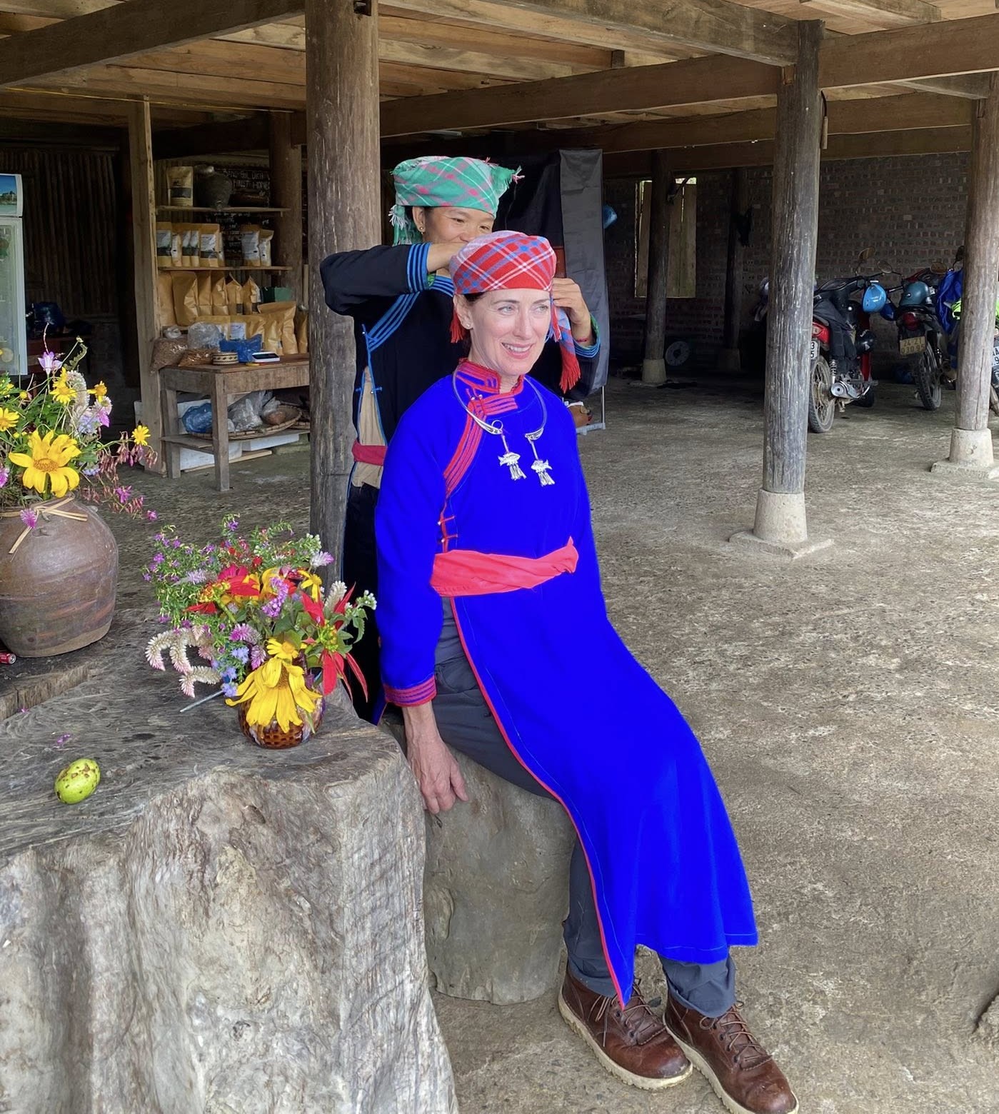 Du khách nước ngoài thử trang phục người Tày tại Bản Liền Forest Homestay.