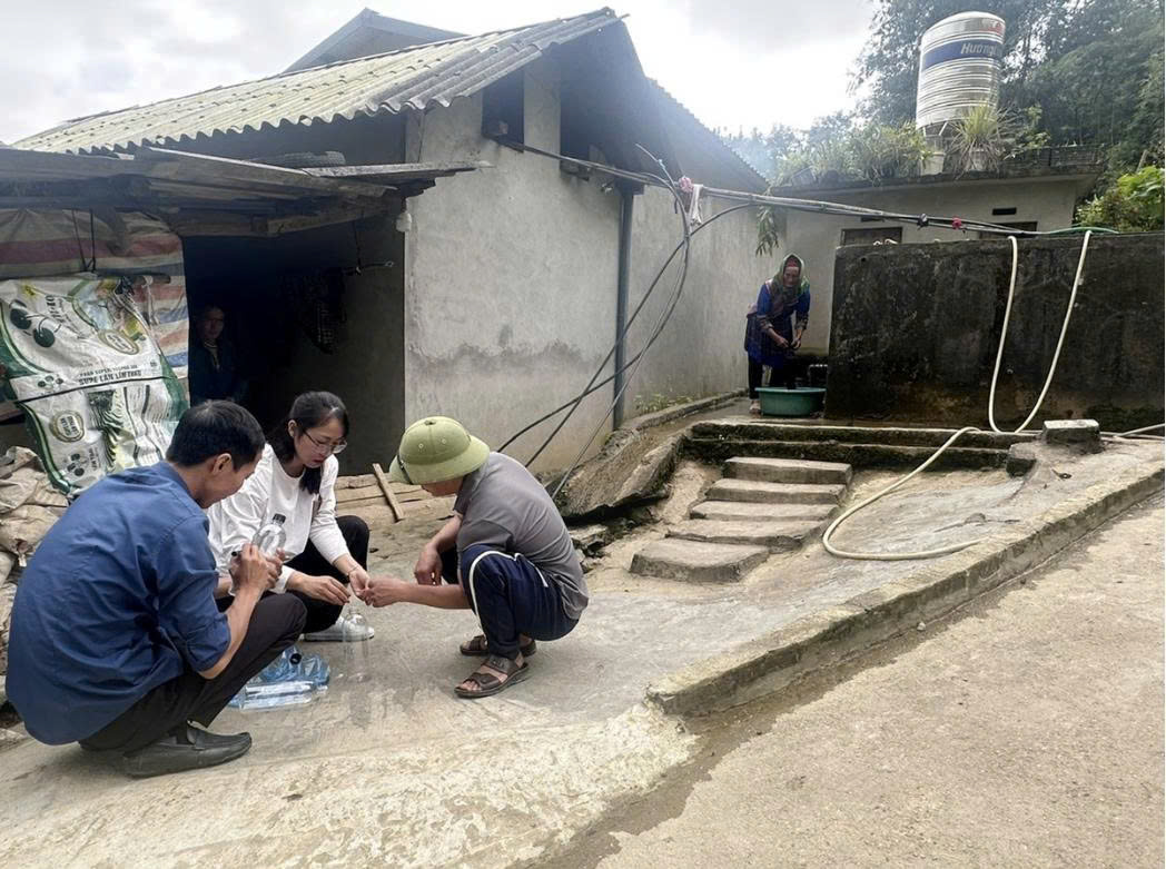 Cán bộ phòng Kinh tế xã Bắc Hà cùng cán bộ Trung tâm Khuyến nông tỉnh Lào Cai lấy mẫu nước tại bể nước tập trung ở thôn Trung La để mang về xét nghiệm.