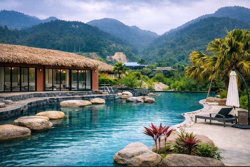 Điểm nhấn của nhiều khu nghỉ dưỡng là hồ khoáng nóng ngoài trời, được thiết kế mở giữa thiên nhiên hùng vĩ. Làn nước xanh ngọc phản chiếu bầu trời và những dãy núi xa xa, khiến du khách chỉ cần thả mình xuống làn nước ấm là đã cảm nhận được sự thư giãn lan tỏa khắp cơ thể.