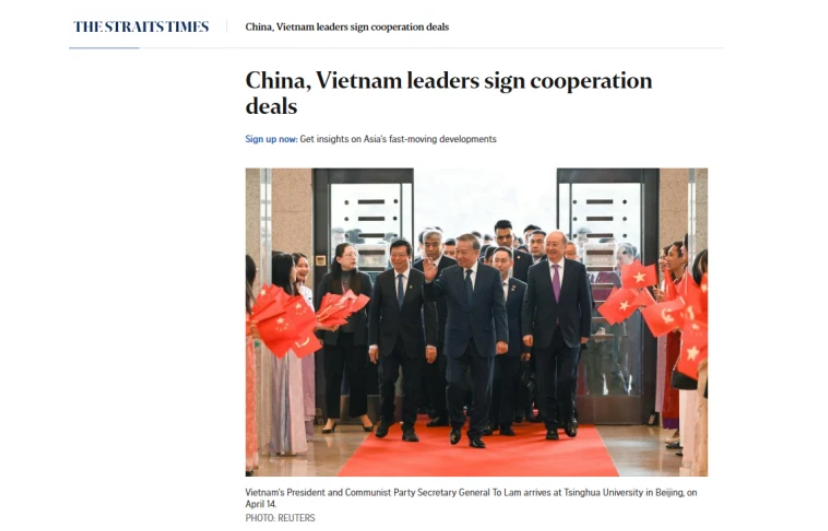 Tờ báo hàng đầu Singapore đồng thời dẫn lại một đoạn trong bài viết của Tổng Bí thư, Chủ tịch nước Tô Lâm đăng trên Nhân dân nhật báo hôm 14/4, rằng Trung Quốc là ưu tiên chiến lược với Việt Nam. Sự hợp tác giữa hai nước cần chuyển mạnh từ tăng quy mô sang nâng cao chất lượng, từ mở rộng thương mại sang gắn kết sâu sắc hơn nữa các chiến lược phát triển, hành lang kinh tế, chuỗi sản xuất, chuỗi cung ứng và cơ sở hạ tầng chiến lược.