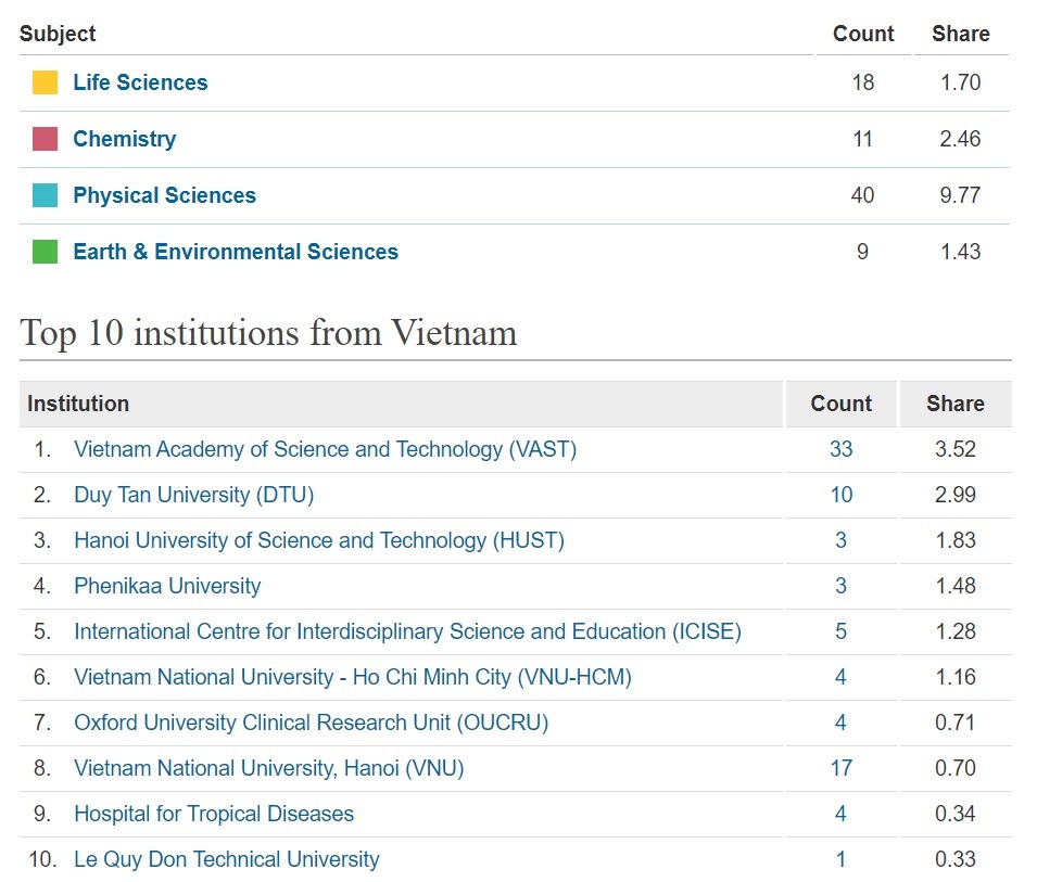 Viện Hàn lâm Khoa học và Công nghệ Việt Nam (VAST) vẫn là đơn vị dẫn đầu danh sách các cơ sở giáo dục đại học, nghiên cứu trong nước về nghiên cứu khoa học với 33 điểm AC; 3,52 điểm FC.