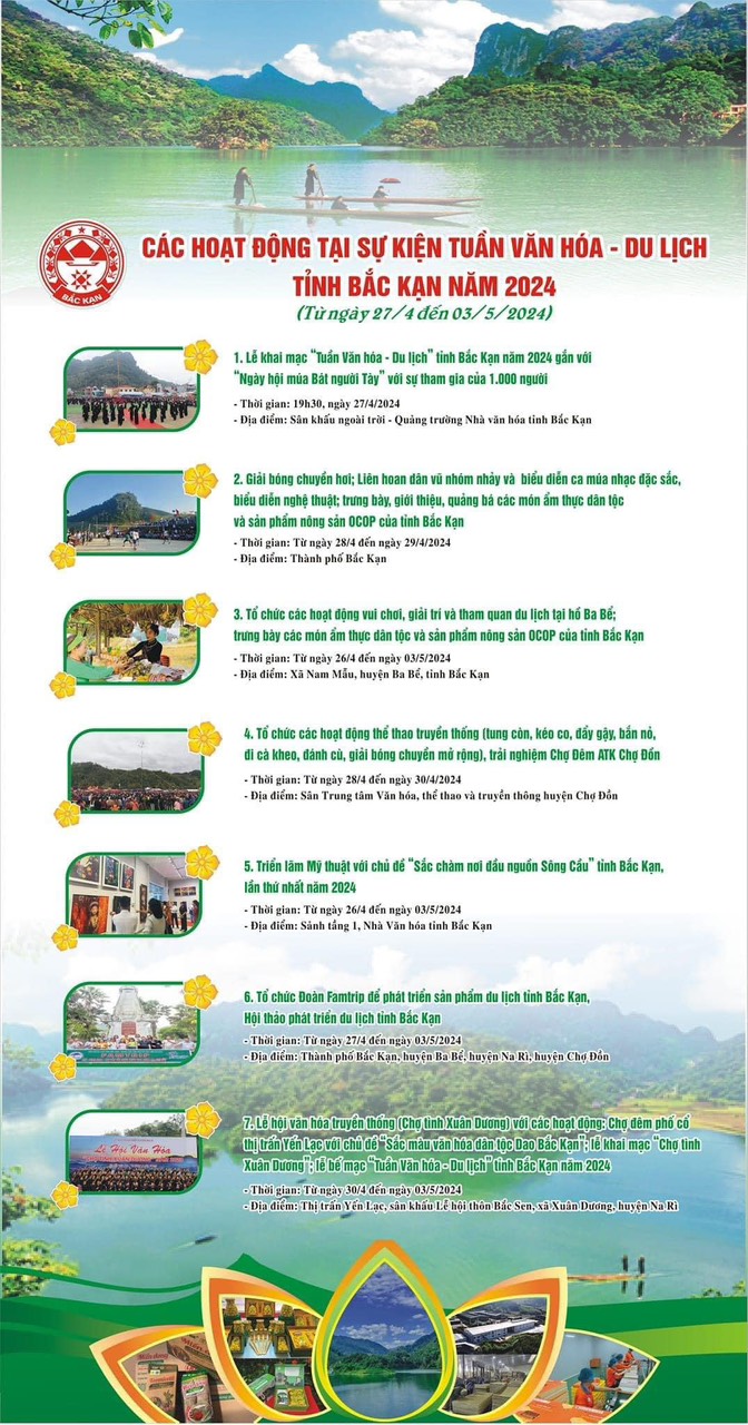 Từ ngày 27/4 - 3/5, Uỷ ban nhân dân tỉnh Bắc Kạn sẽ tổ chức “Tuần Văn hóa - Du lịch” tỉnh Bắc Kạn năm 2024.