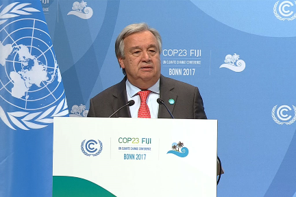 Phát biểu tại Hội nghị thượng đỉnh Liên hợp quốc về biến đổi khí hậu (COP23) ngày 15/11, Tổng thư ký António Guterres đã lên tiếng kêu gọi tăng cường nỗ lực, khả năng lãnh đạo và hợp tác để đấu tranh chống biến đổi khí hậu.