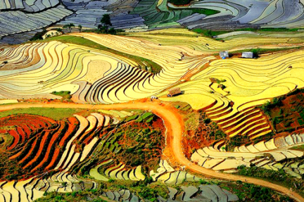 Trong khi lúa một vụ ở nhiều nơi đang trổ đòng và còn xanh mướt thì những thửa ruộng bậc thang ở xã Sàng Ma Sáo, huyện Bát Xát đã bắt đầu ngả sang màu vàng, tạo thành một bức tranh với đường nét và màu sắc tuyệt đẹp.