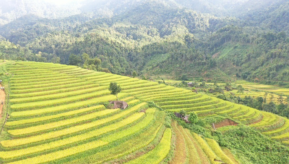 Cả một thung lũng lòng chảo bên dòng Nậm Luông những ngày này bắt đầu chuyển màu vàng rực. Những bông lúa uốn câu nặng trĩu chờ ngày thu hái. Đồng bào Tày ở Nghĩa Đô (Bảo Yên) tranh thủ những ngày nắng ráo, thời tiết thuận lợi để gặt lúa.