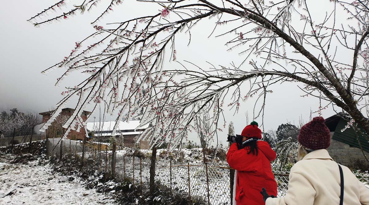 Sau khi biết thông tin có tuyết rơi tại khu vực Y Tý, rất đông du khách đã đổ về đây thưởng lãm hiện tượng thiên nhiên thú vị này.