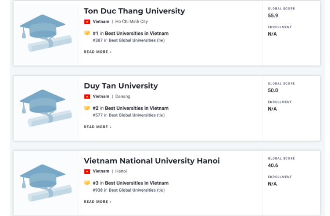 Việt Nam có 3 trường thuộc Tốp 1.000 cơ sở giáo dục đại học nghiên cứu hàng đầu thế giới là: Trường Đại học Tôn Đức Thắng, Trường Đại học Duy Tân và Đại học Quốc gia Hà Nội.