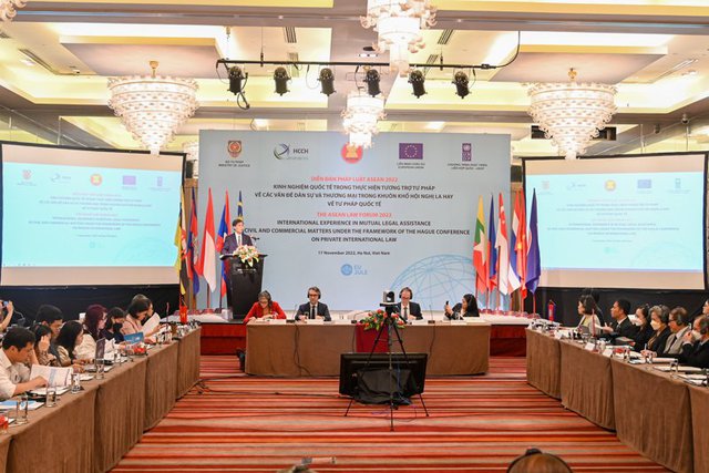 Ngày 17/11, Bộ Tư pháp phối hợp với Dự án tăng cường pháp luật và tư pháp tại Việt Nam (EU JULE) tổ chức Diễn đàn pháp luật ASEAN "Kinh nghiệm quốc tế về tương trợ tư pháp trong lĩnh vực dân sự và thương mại trong khuôn khổ Hội nghị La Hay về tư pháp quốc tế (HCCH)" với mục tiêu thúc đẩy sự hợp tác pháp luật và tư pháp giữa các nước trong khu vực ASEAN và hỗ trợ các nước thành viên ASEAN cùng đẩy mạnh nghiên cứu, gia nhập các thiết chế đa phương về tương trợ tư pháp trong lĩnh vực dân sự và thương mại.