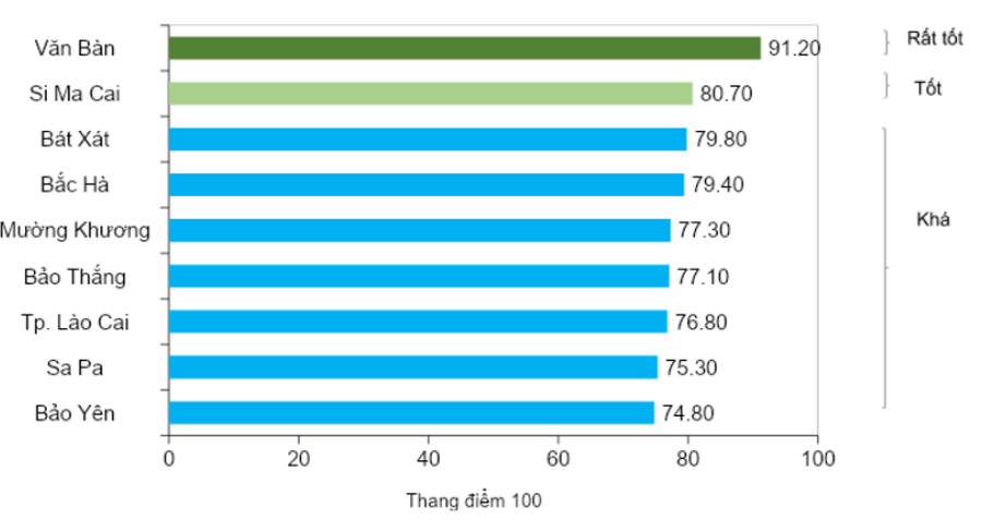 县级DDCI报告显示,Van Ban县在经济管理能力和改善的商业环境方面都属于“非常好”组(得91.2分),位居第一。Si Ma Cai县得 80,07分,经济管理能力属于 “很好”组。Bat Xat, Bac Ha, Muong Khuong, Bao Thang, 老街市, Sa Pa市得分在75,3 到79,8分之间,位于“好”组。Bao Yen 县的分数为74,8排名最后。