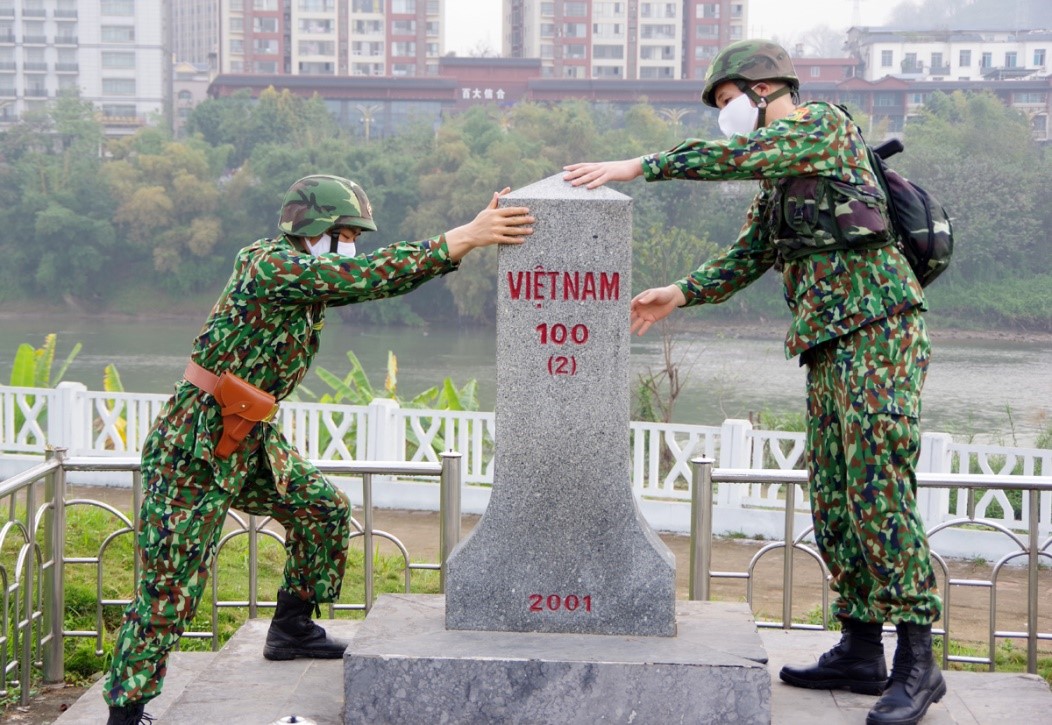 在老街-河口国际口岸分界线上,老街省边防司令部副司令员TRAN VIET HUYNH上校与洪河边防管理人员ZHAO ZHI HAO先生讨论并商定了此次会议的内容和方案巡逻以确保预防和控制 Covid-19疫情。