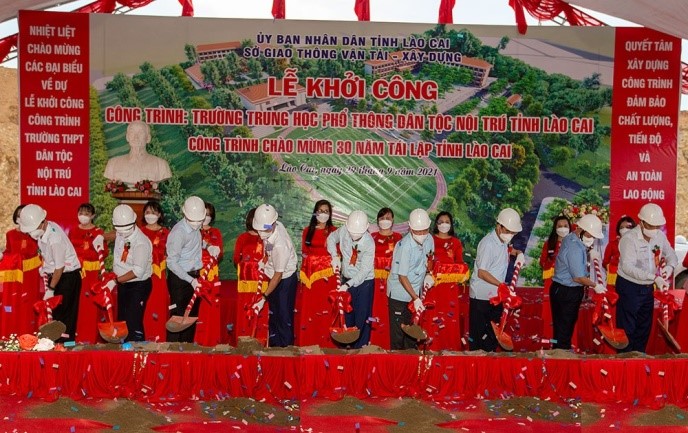 老街少数民族寄宿高中建于平明区(老街市),占地近10公顷,总投资超过2000亿越南盾,来自国家预算的教育事业之都。投资项目由德团建设投资有限公司分两期建设,一期平整地面及建设配套项目,第一期总投资1210亿越南盾;二期建设街区及配套项目总投资1000亿越南盾。