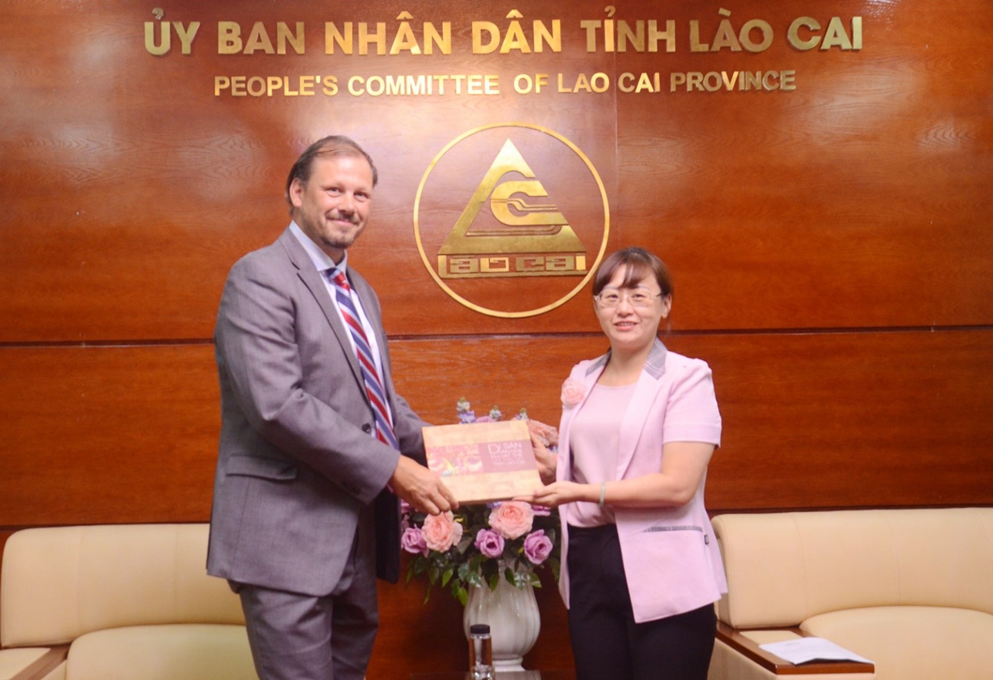 省人民委员会副主席Giang Thi Dung向老街加拿大国际学校赠送老街省民族照片书